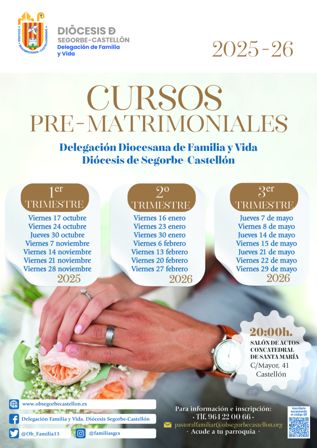 Con esta iniciativa, la Diócesis de Segorbe-Castellón reafirma su compromiso con la familia y la preparación integral al matrimonio, alentando a los novios a vivir este tiempo como una oportunidad para construir un proyecto de vida común sustentado en los valores del Evangelio. Siguiendo el reciente consejo del Papa León XIV, los novios también pueden comenzar a practicar la oración conjunta —por ejemplo, a través del rezo del Rosario— como un modo de fortalecer la relación y aprender a crecer juntos en la fe, sentando así las bases de una futura vida matrimonial sólida y espiritual.